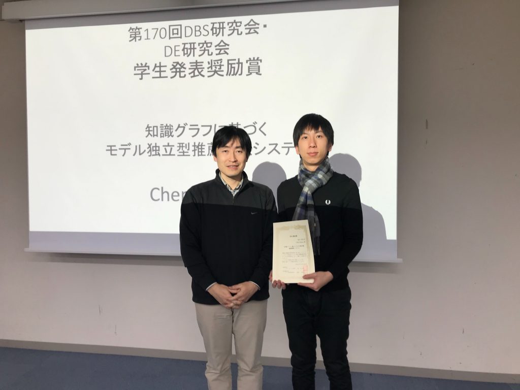 第170回データベースシステム研究会ならびに電子情報通信学会データ工学研究会において、当研究室のチン(修士2年)が学生奨励賞を受賞しました。
