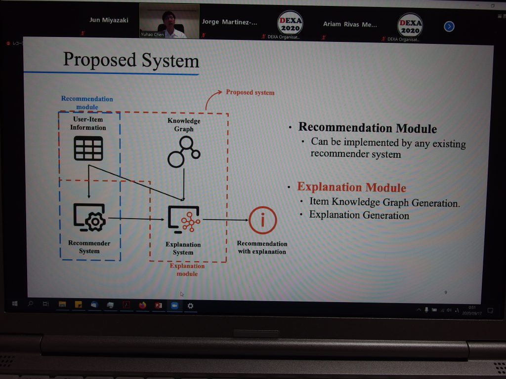 9月14日~17日にオンラインで開催されたThe 31st International Conference on Database and Expert Systems Applications – DEXA2020にて、2020年3月修士課程修了のチン君が、”A Model-agnostic recommendations Explanation System Based on Knowledge Graph”とのタイトルで修士での研究成果を発表しました。