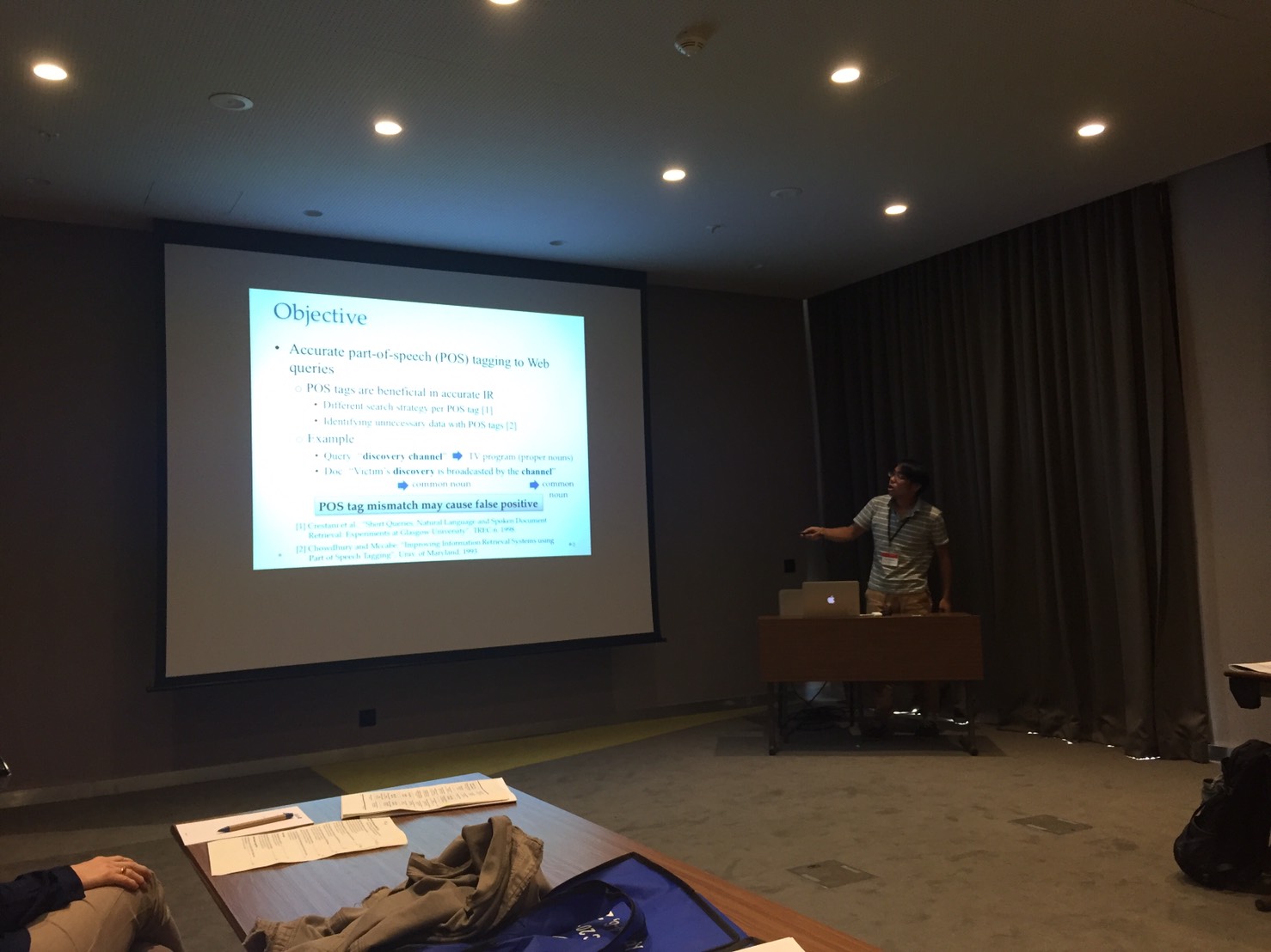 Symposium on “Applied Computing” という名が表す通り,SAC は多様なトラックから構成されており,ソフトウェア工学やバイトインフォマティクス,IoT と,全国大会のような雰囲気でした.私は IAR (Information Access and Retrieval) にて,大規模データを使い Web クエリに対して正確に品詞を付与する手法を発表しました (タイトルは “Part-of-speech Tagging for Web Search Queries Using a Large-scale Web Corpus”).